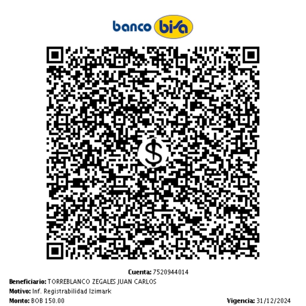 El pago corresponde a Bs 75 Servicio IZIMARK + Bs 75 Tasas SENAPI